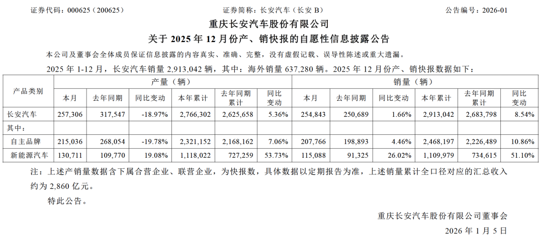 「图片来源:长安汽车2025年12月产销快报」