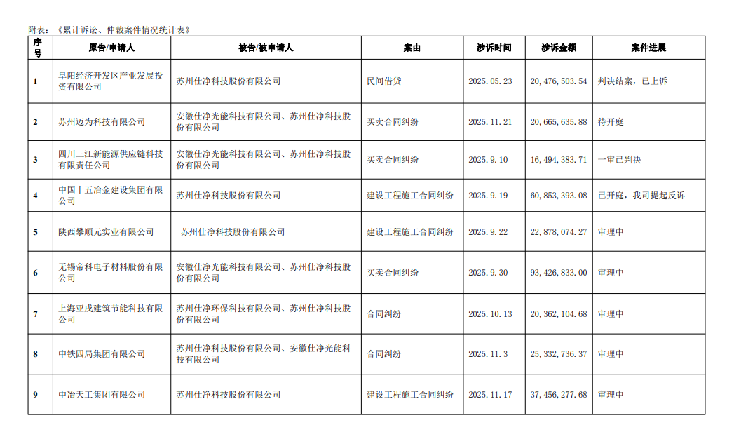 仕净科技表示,公司及控股子公司过去连续十二个月内累计诉讼、仲裁事项(含过去十二个月前发生但近期已结案的诉讼)涉案金额合计约为112,467.54万元人民币,其中已撤诉及结案金额为58,050.04万元,未结诉讼金额为54,417.49万元,未结诉讼金额占公司最近一期经审计净资产绝对值的51.79%。上述案件共135起,涉及应收账款的买卖合同纠纷、建设工程施工合同纠纷及租赁合同纠纷等。其中,公司及子公司作为原告涉及的诉讼、仲裁共计13起;公司及子公司作为被告涉及的诉讼、仲裁共计122起。