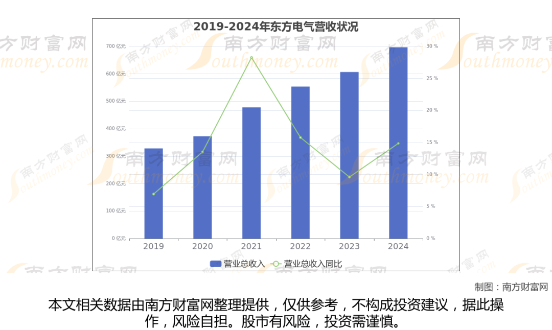 据年报数据显示(如上图),东方电气过去一年实现营业收入696.95亿,同比增长14.86%,近5年复合年增长率16.93%。