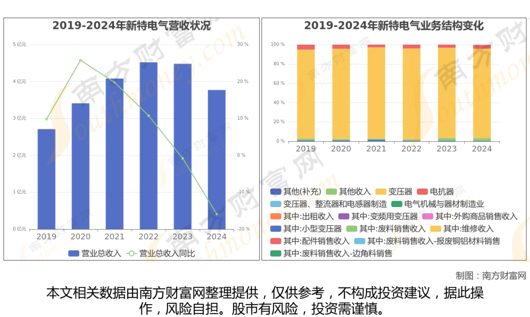(如上图)2024年新特电气公司营业总收入3.77亿,同比增长-15.88%,近五年复合增长率为2.57%。