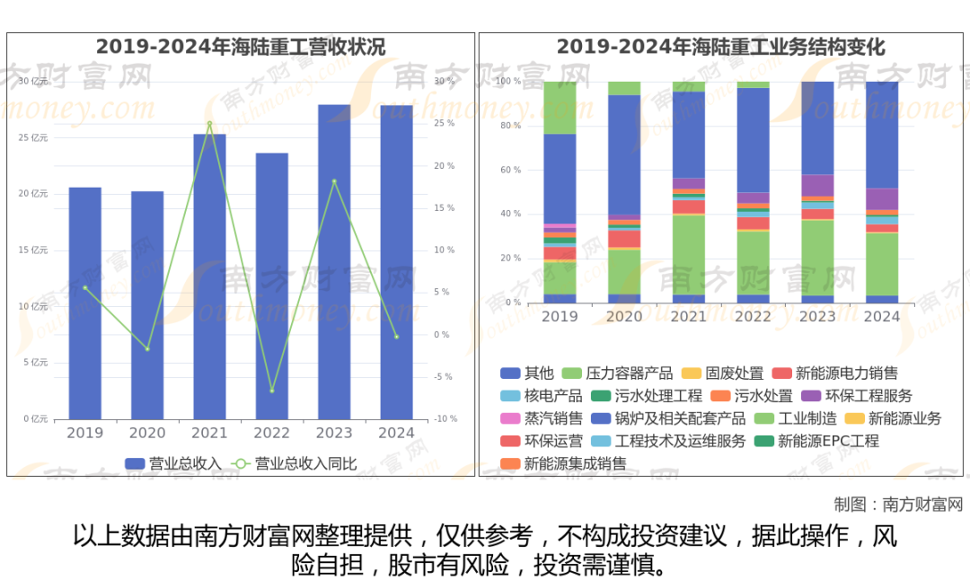 海陆重工于2008年6月25日在深圳证券交易所上市,公司主营业务为工业余热锅炉、大型及特种材质压力容器和核安全设备的制造销售业务,以及固废、废水等污染物处理和回收利用的环境综合治理服务及光伏电站运营业务。