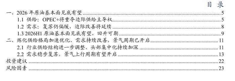 进入2026年,随着供给过剩的预期正逐步转为现实,OPEC 决定在2026Q1暂停增产,我们认为这是OPEC 进行防御性观望(维护油价)的信号。目前OPEC 仍有约124万桶/天的减产转回余量,如果这124万桶/天的余量在2026年内最终得以实施,考虑到其分步释放的节奏,我们预计将为2026年全年带来超150万桶/天的平均产量增量,或导致原油市场累库过快。目前来看,OPEC 增产的具体时机、节奏和幅度都存在高度不确定性,将完全取决于彼时的油价水平(如25年中期油价受地缘因素影响抬升为OPEC 继续增产创造条件)、全球库存变化(如25年中国原油库存吸纳量较大、夏季出行高峰、OPEC 前期实际增产不及预期)及宏观经济需求信号。若2026年油价中枢下跌超预期,不排除OPEC 暂停增产甚至转为减产来维护油价的可能性。