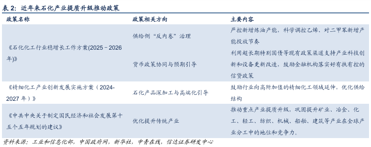 政策端强势推进落后炼能退出,行业由从“量”的扩张转向“质”的提升。2025年5月国家发改委再次强调,要加快淘汰炼油等行业低效落后产能,优化产业布局,遏制落后产能无序扩张;“反内卷”政策加码,2025年7月中央财经委员会第六次会议召开,会议强调,纵深推进全国统一大市场建设,要聚焦重点难点,依法依规治理企业低价无序竞争,引导企业提升产品品质,推动落后产能有序退出,国内落后炼油产能存在高能耗、产品单一、高端产品不足等多特征。从具体举措看,主要通过严控新增炼油产能,科学调控乙烯、对二甲苯等大宗产品产能投放节奏、推动落后炼油产能出清等手段实现石化行业“反内卷”治理,并引导行业产能供给向深加工和高端化引导,推动石化产品附加值提升,实现从“量”的扩张转向“质”的提升。