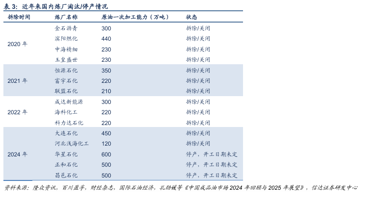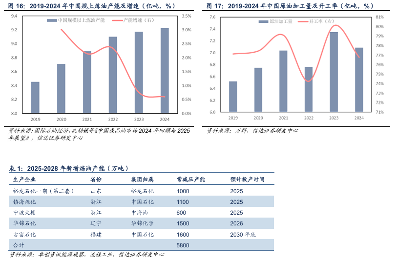 供给侧增量放缓,行业扩能接近尾声。2024年国内规模以上炼油产能合计达到9.23亿吨,同比增长0.6%,产能增速同比下降0.2pct。产能变化主要来自:山东裕龙石化在2024年四季度成功投产了一套1000万吨/年的大型炼油装置,大连石化关停了450万吨/年的炼油能力,整体来看国内炼油产能存在增量与减量共存的发展局面。根据国家发改委等四部门发布的《关于促进炼油行业绿色创新高质量发展的指导意见》,到2025年,国内原油一次加工能力控制在10亿吨以内,千万吨级炼油产能占比55%左右,产能结构和生产力布局逐步优化。根据我们统计,预计2025-2030年期间或将有5800万吨新增炼油产能,考虑到2024年国内炼油产能9.4亿吨,我们预计未来三年炼油产能总量将接近政策“红线”,2025年后炼化扩能也将接近尾声。
