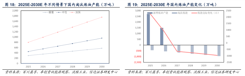 潜在炼能淘汰规模庞大,行业有望逐步进入存量竞争时代。回顾历史炼能淘汰情况,在前述政策指引下,近年来国内炼能淘汰项目主要集中于100-300万吨产能,根据百川盈孚数据,当前全国300万吨及以下炼油产能合计约7662万吨,我们认为该类中小型炼厂均有面临淘汰可能。我们分偏缓、中性、加快三种炼能淘汰情景进行假设并展望至2030年,根据我们统计,200万吨以下、250万吨以下、300万吨以下炼油产能分别为2620、4222、7662万吨,在偏缓淘汰情景下,假设2030年前200万吨以下产能淘汰完毕;在中性淘汰情境下,假设2030年前250万吨以下产能淘汰完毕;在加快淘汰情景下,假设2030年前300万吨以下产能淘汰完毕。考虑到近年来产能约束、淘汰出清政策趋严,假设炼能淘汰数量每年线性增长。我们结合计划投产的新增炼能,预计未来国内炼能边际增量将逐步趋缓,行业或将步入存量竞争时代。