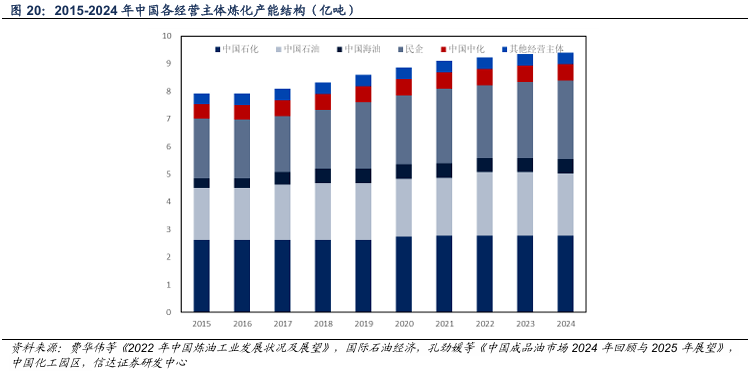 从产能结构角度看,民营炼化先进产能集中度提升。从产能结构看,根据我们统计,2024年以中石油、中石化、中海油、中化为代表的主营炼厂产能合计6.14亿吨,但其产能占比由2015年的68%下降至2024年的65%;民营炼化产能合计2.84亿吨,其产能占比由2015年的27%提升至2024年的30%。截至“十三五”末期,民企的两座千万吨炼厂合计炼油能力6000万吨/年(浙石化二期考虑入内),此类行业先进产能占民企炼油总能力的27.7%,而到2024年,民营千万吨炼油产能合计10100万吨,占民营炼厂总能力达到36%,民营炼厂产能占比明显提升。伴随落后产能淘汰和民营大炼化崛起,特别是以浙石化、恒力石化、盛虹炼化等为代表的先进一体化优势产能投建,有效提升了石油资源的利用效率,头部先进炼化产能集中度持续提升。