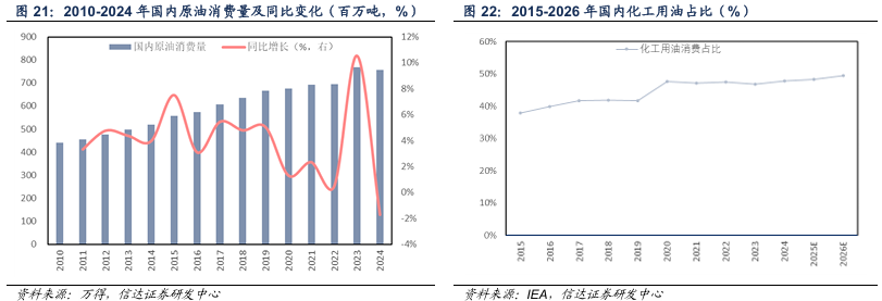国内石油消费结构转变或进一步深化。受成品油达峰影响,2024年国内石油消费为近年来首次负增长,与之对应的化工用油消费仍保持增长,根据IEA数据,2024年中国化工用油消费量为796万桶/天,同比增长3%。受国内成品油消费达峰和化工用油消费增长影响,国内石油消费结构转变进一步深化,2024年国内化工用油消费占石油消费约48%,我们预计到2026年国内化工用油消费占比有望提升至50%,国内石油消费结构转变或将进一步深化,化工用油或成为国内石油消费增长的核心动力。