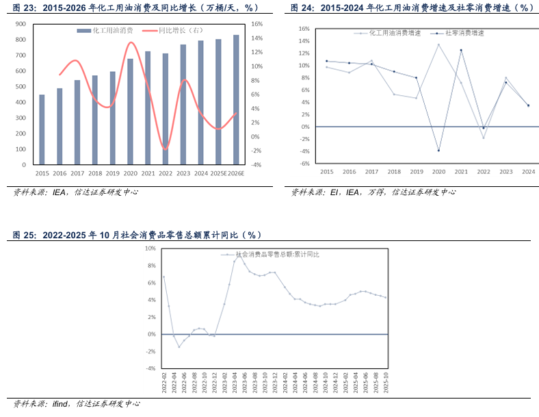 化工用油需求仍处于长期增长通道中,缓慢复苏或成为需求增长主基调。从化工用油实际消费量角度看,因我国人均化工品消费量总体仍较低,当前正处于持续提升阶段,除2022年因疫情抑制国内经济活动,导致需求阶段性下跌外,近年来整体保持稳健增长。根据IEA预测,2025-2026年国内化工用油需求年均增速约1%-4%,整体保持缓慢复苏态势。此外,剔除2020年疫情因素影响,近年来社会零售品消费增速与化工用油消费增速变化存在一致性,在促消费相关政策支持下,当前社零消费保持稳步复苏态势,也有望进一步支撑化工用油需求,石化化工品需求或仍处于长期增长通道。