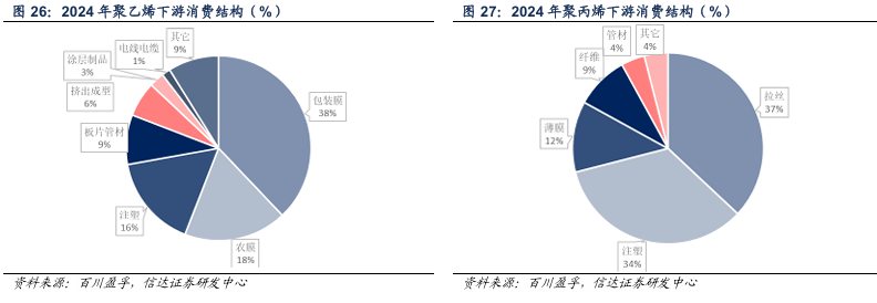 聚乙烯和聚丙烯作为两大通用塑料,因分子结构和性能差异,下游应用领域略有区别。聚乙烯材料主要用于膜类产品,包装膜和农用薄膜占比超过50%,多为一次性消费品,常用于日常生活和农业领域,其次为注塑、板片管材等,主要应用于日常生活和地产行业;聚丙烯下游主要用于拉丝、注塑等领域,终端应用领域主要涉及水泥、化肥及粮食等产品包装、汽车、家电以及地产行业等,总体来看,我们认为聚烯烃下游应用主要来自地产基建及居民日常消费。