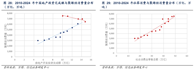 扩大内需背景下,聚烯烃表观消费仍保持增长。2024年底,中央经济工作会议将“大力提振消费、提高投资效益,全方位扩大国内需求”列为2025年9项重点任务之首,消费在内需扩大的重要性更加突出。近年来由于国内地产复苏疲软,对聚烯烃需求拉动有限,居民消费成为聚烯烃需求增长关键力量。我们比较了历史地产投资和社零消费对聚烯烃需求的拉动影响,从二者的数据分布可以看出,近年来地产投资有所下行,其对聚烯烃消费拉动偏弱,而社零消费仍保持增长,并与聚烯烃消费量变化保持较高的正相关性。在扩大内需背景下,聚烯烃消费量有望保持增长。