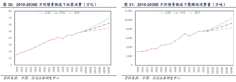 我们通过预测未来社零消费增速和规模来对聚烯烃消费增速进行预测。我们分别做了乐观、中性和保守三种情景假设,并剔除了2020年疫情背景下的特殊影响。我们发现从“十一五”至“十四五”期间,社零消费增速中枢在不同阶段均有所下行,但降幅逐步收窄,“十四五”以来社零消费增速中枢约6%,较“十三五”下降2pct,我们以“十五五”阶段社零增速较“十四五”下降2pct作为中性假设,即4%;乐观假设下,假设社零增速与“十四五”一致,即6%;保守假设下,社零消费增速大幅下降,降幅与“十一五”至“十二五”增速中枢降幅4pct一致,即社零消费增速仅2%。根据我们测算结果,在中性假设下,我们预计2025-2030年聚烯烃表观消费增速在1-4%左右。