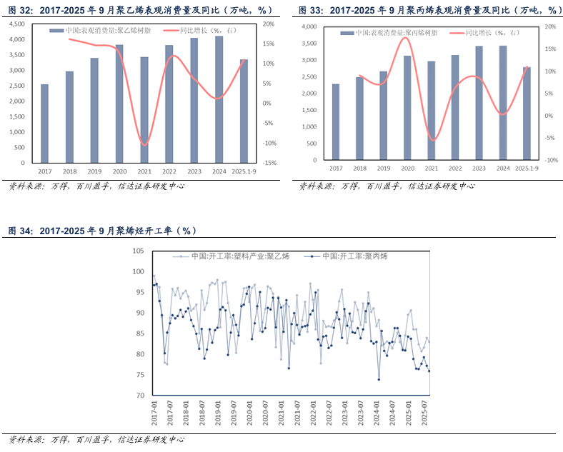 受制于供给释放,聚烯烃开工负荷提升偏缓。近年来受民营大炼化投产、轻烃裂解项目上马,聚烯烃保持较高的产能增速,2018-2024年产能平均增速为12%,2020年后产能增速高于表观需求增速。截至2025年9月,国内聚烯烃产能为8866万吨,同比增长17%,表观消费量6710万吨,同比增长11%,表观消费量的高增速主要系新装置带来的产量释放。根据我们在《2025年石化行业年度策略报告——炼化周期筑底,景气复苏可期》的结论,大宗化学品景气度与开工率同频,而在供给侧增量释放、实际需求增长有限背景下,近年来聚烯烃产品开工负荷提升相对偏缓。