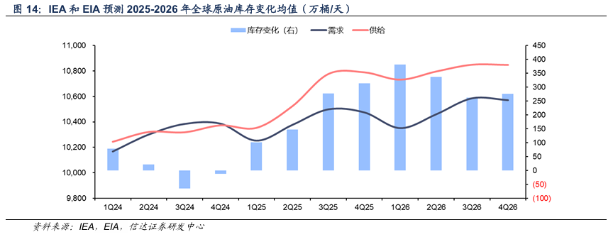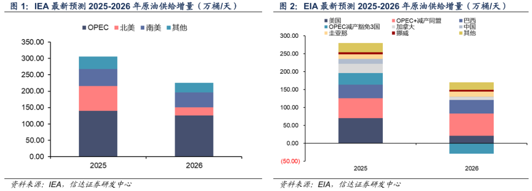 2)分歧观点:在于对OPEC 内部产能、政策意愿及市场策略的不同判断,IEA认为2026年OPEC 供应增量或超百万桶(内含假设OPEC当前产量政策不变,即2026年全年不再继续增产),EIA则认为OPEC 供应增量约为60万桶/天,并表示2026年OPEC 实际产量或低于其目标产量,OPEC 已经宣布在2026Q1暂停增产,未来或也将采取适度措施防止库存增加过快而进一步压低油价。
