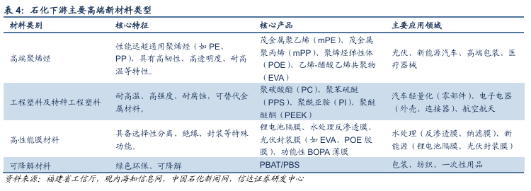石化下游高端新材料是指具有高技术含量、高应用性能、高市场价值等特性,应用于高技术领域和战略性新兴产业的石化化工材料。与传统大宗石化产品相比,其技术壁垒高、附加值高、成长性好,石化高端新材料是石化产业面向精细化、高端化发展的关键标志。根据中国石化经济技术研究院数据,2024年我国高性能材料自给率仅54%左右,其中,关键单体及中间体自给率最低,高端聚烯烃市场份额最大,部分领域仍需加快发展。石化高端新材料主要可划分为高端聚烯烃、工程塑料及特种工程塑料、高性能膜材料和生物基及可降解塑料四大类。