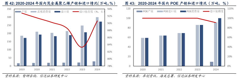 高端聚烯烃:进口替代正当时。茂金属聚烯烃、聚烯烃弹性体等高端聚烯烃产品上产速度偏缓,进口依赖度仍保持较高水平。茂金属聚乙烯方面,在国内消费扩张和高端包装等需求刺激下,2024年茂金属聚乙烯表观消费量约达300万吨,同比增长21%,但进口量高达272万吨,进口依赖度高达91%。聚烯烃弹性体方面,过去POE产品长期依赖进口,直到2023年12月国内首套工业化装置才投产,根据海关总署数据,2024年国内POE进口量仍高达91万吨,进口依赖度超过90%,而近年来受益于光伏、新能源汽车等下游需求扩张,2021-2024年POE消费量平均增速高达14%,高端聚烯烃方面或存在新兴产业带来的需求扩张与国内产能自给不足的供需错配局面。