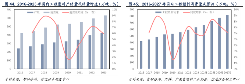工程塑料、锂电隔膜:新能源汽车产业带来强劲需求拉动。工程塑料的轻量化、高强度等性能使其在汽车、电子、建筑、机械及航空航天等领域具有广泛应用,近年来,受益于国内新能源汽车快速发展,叠加新能源汽车较传统燃油车塑料用量更高,推动工程塑料需求量提升。我们对未来国内工程塑料需求进行预测:1)单车塑料用量:根据生物塑料研究院数据,传统燃油车塑料消耗均值145公斤,新能源车则超过180公斤,扣除PP、PE等大宗塑料产品占比,工程塑料占比约73%;2)汽车产量:2025年1-9月国内汽车总产量同比增长11%,假设2025年汽车总产量增速10%,2026-2027年产量增速年均下降2pct,2025年1-9月国内新能源汽车总产量同比增长30%,假设2025年新能源汽车总产量增速30%,2026-2027年产量增速年均下降5pct;3)其它领域工程塑料消费量:以2020-2023年平均增速4%为基准,2025-2027年保持不变。根据我们测算,我们预计2025-2027年国内工程塑料消费量年均增速在6-8%,新能源汽车有望对工程塑料需求带来强劲拉动。