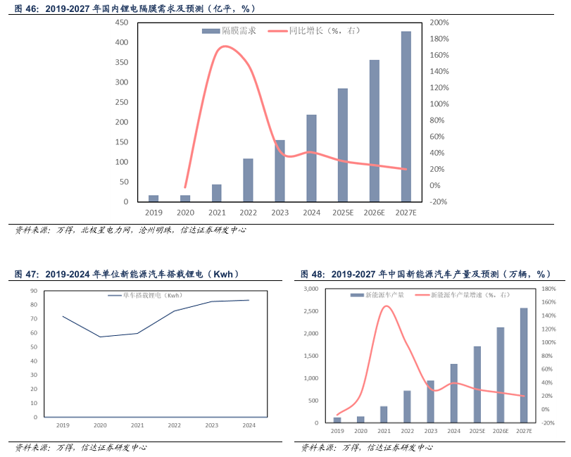 锂电隔膜需求空间测算:1)单车搭载锂电:我们根据2019-2024年国内锂电池产量数据和新能源汽车产量数据测算,近年来单车搭载锂电池呈现稳步提升趋势,我们假设2025-2027年单车搭载锂电与2024年保持一致;2)新能源汽车产量:与前文预测保持一致;3)单位动力电池隔膜消费量:根据北极星储能网、行业龙头沧州明珠数据,1GWh的动力电池约消耗2000万平方米隔膜。2024年国内锂电隔膜消费量约219亿平,同比增长41%,根据我们测算,预计2025-2027年国内锂电隔膜消费量增速略有放缓,但仍将保持20-30%的高增速。