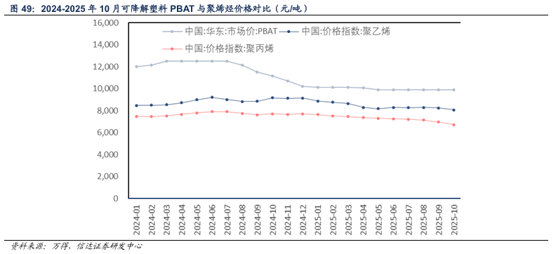 可降解塑料:“限塑令”推动市场空间打开,但价格是当前市场扩张的主要制约。政策方面,早期的“限塑令”更侧重于限制超薄袋和有偿使用,2020年的新规更强调对不可降解塑料制品的禁止和限制,覆盖的产品种类和领域更广,进一步拓宽了可降解塑料的市场容量。价格方面,以石油基可降解塑料PBAT为例,当前PBAT单吨价格较传统的聚乙烯、聚丙烯产品高约20-50%,对其市场渗透带来一定制约。我们认为,未来可降解塑料需求改善主要来自两大方面,一是规模化装置投产后带来的成本压降,进而降低产品价格,提高产品市场竞争力;二是政策端方面进一步强化约束和监管。