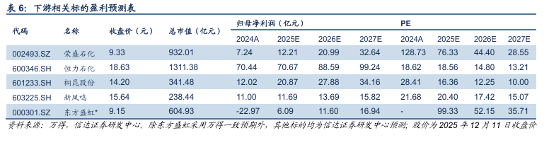 下游炼化方面,我们重点推荐具备规模优势、化工产业链条长、高附加值产品布局丰富的民营大炼化企业:恒力石化(600346.SH)、荣盛石化(002493.SZ);逐步增强产业链协同优势的涤纶长丝龙头桐昆股份(601233.SH)、新凤鸣(603225.SH);建议关注:东方盛虹(000301.SZ)。