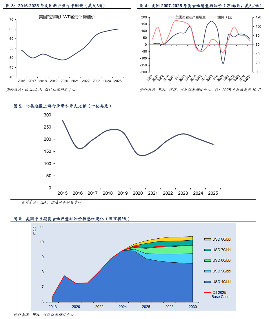 当前,我们认为,美国页岩油对市场的调节作用呈现出非对称性,油价上涨带来的增产弹性弱于油价下跌带来的减产弹性,美国页岩油对油价有底部支撑作用(有效抑制油价的极端下跌,2025年成本平均为65美元/桶),但高油价下迅速增产能力减弱(制衡油价飙升能力削弱)。