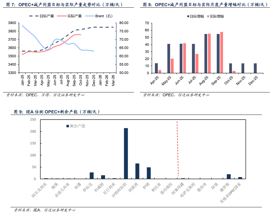 2025年,OPEC 的核心任务是在控制市场节奏的前提下,系统性地回收因前期大幅减产而退出的市场份额。OPEC 已在25年9月完成了220万桶/天的增产计划并在10月启动了165万桶/天的减产转回,165万桶/天的增产节奏已经放缓。从实际效果看,到2025年10月,OPEC 的实际增产幅度较4月已超过200万桶/天,2025年OPEC 的平均产量较2024年增加了约65万桶/天。