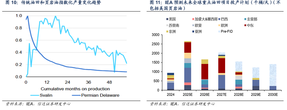 一方面,全球上游行业大型项目在未来几年将持续向市场投放,剔除中东区域,全球每年新增项目投产平均或超100万桶/天。我们将未来主要项目分为两类,已最终投资决策项目(已获批准,正处于建设阶段,确定性较高)和待最终投资决策项目(pre-FID,有初步开发计划,但尚未做出最终商业决定,受未来油价和投资环境的影响较大,本文统计数据参考IEA,仅考虑已经进行一些采购且投资确定性较大的项目)。根据IEA项目统计,未来原油主要增量来源高度集中,美国(深水与页岩)、中东(以沙特、阿联酋为主)、巴西(盐下超深水)和圭亚那(斯塔布鲁克区块)构成了未来新增供应的绝对主力。中东的新增产能(如沙特、阿联酋的扩产计划)预计在2026-2027年集中释放,而巴西与圭亚那的巨型海上项目则将在2025-2030年间持续、分阶段投产,提供长期但相对平稳的增量。