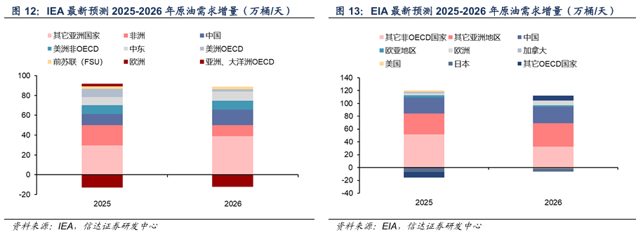 从总量来看,2026年原油需求增量仍保持稳定,增长区间维持在80-100万桶/天。IEA预测2025、2026年全球原油需求增量分别为79、77万桶/天,EIA预测2025、2026年全球原油需求增量分别为105、106万桶/天。