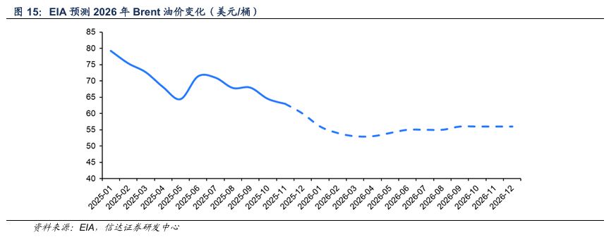 在此背景下,2026全年平均油价预计将较2025年有所下滑,但美国&加拿大等高成本油田边际产量支撑、间歇性地缘政治风险溢价、OPEC 稳定市场行为或将为油价提供一定支撑,使其难以崩溃。我们认为,2026年油价中枢有望在多重因素制衡下,维持在55-65美元/桶的区间内宽幅震荡。