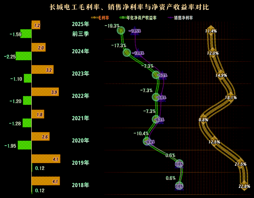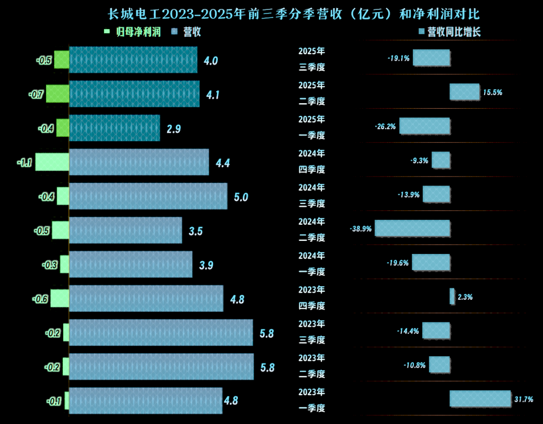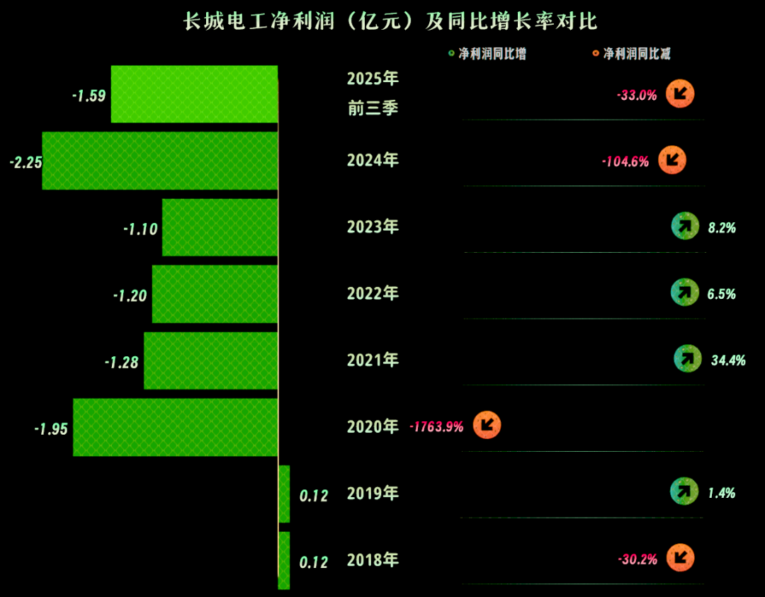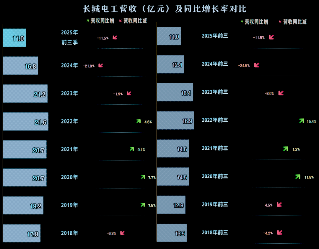 2025年前三季度,长城电工的营收同比下跌11.5%,11亿元的规模,是图中近八年前三季度中最低的水平,实际上是2011年以来的同期最低。从2020年超过20亿元之后,长城电工的营收增长变慢,连续五年在20亿元左右徘徊; 从2024年加速下跌以来,营收有点稳不住的感觉。