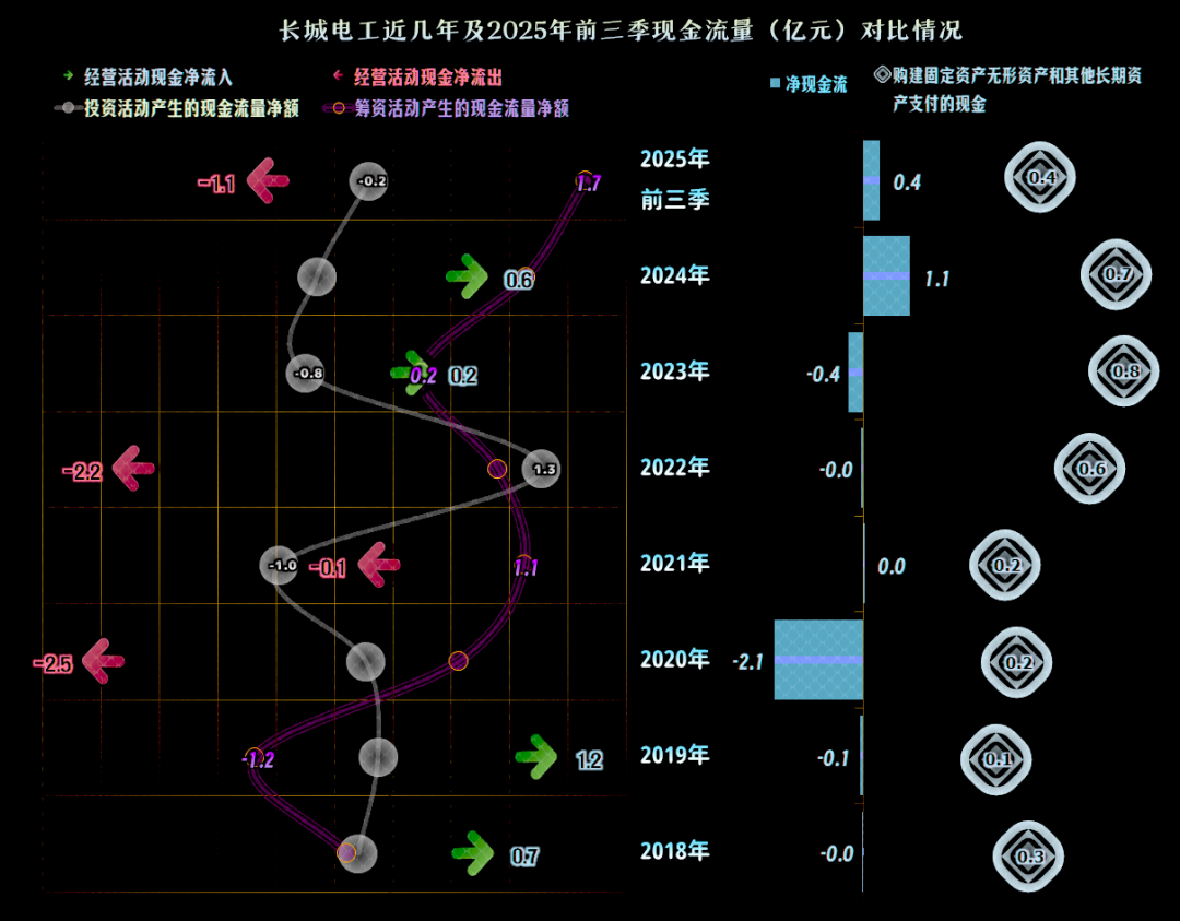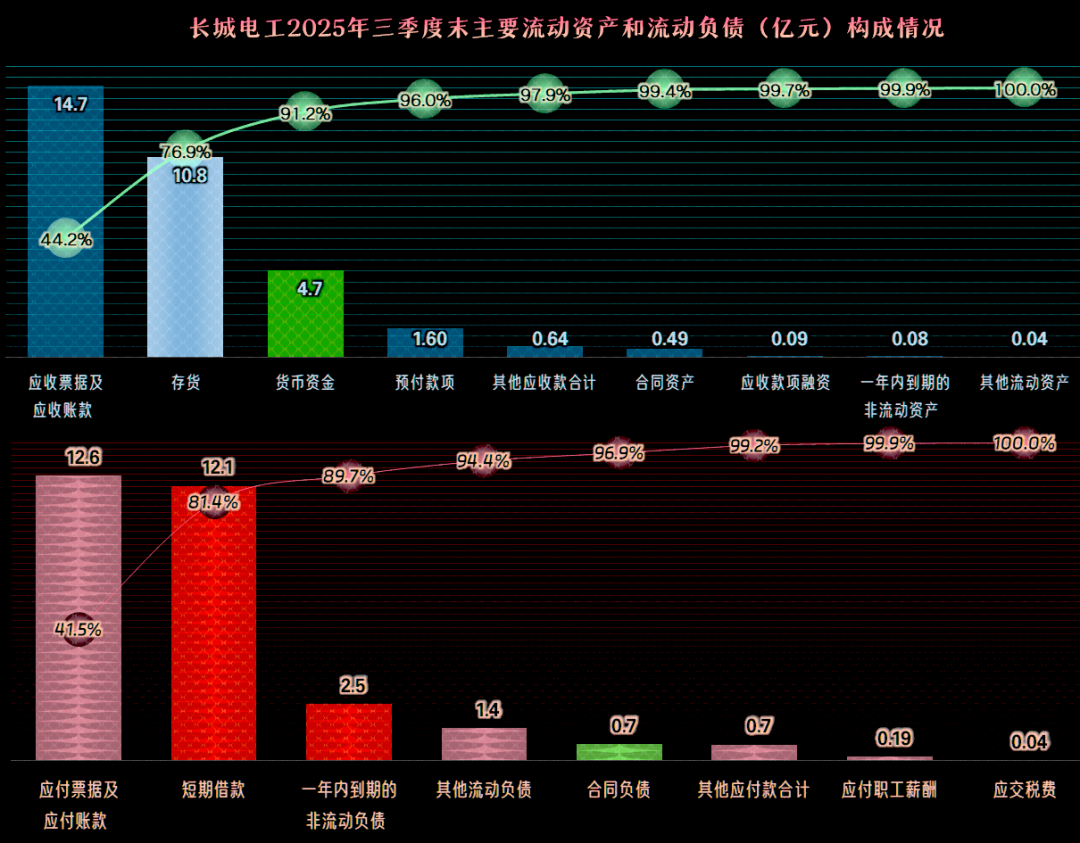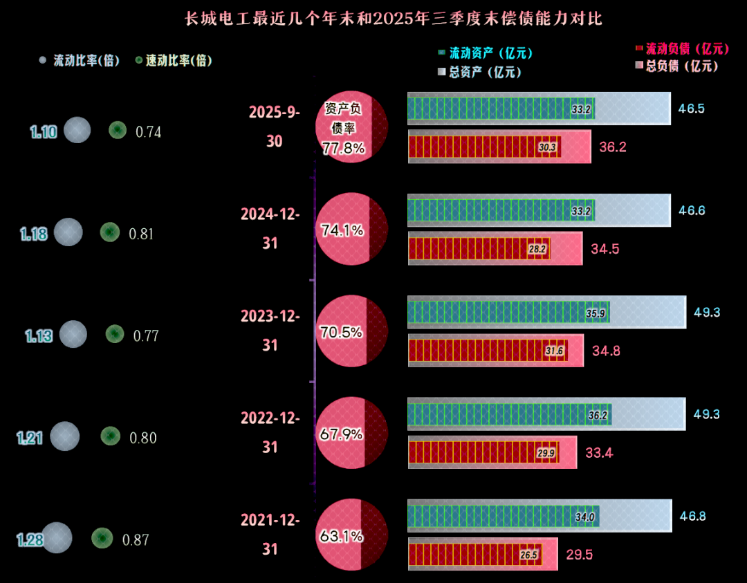 长城电工的资产负债率持续上升,2025年三季度末已经接近八成了,年末可能会达到或超过八成。长期偿债能力并不强,如果不依靠外力,自身的再融资能力也不是太大了。短期偿债能力看起来变化不大,这方面暂时出不了问题,但前提条件是经营形势要能稳定下来才行。