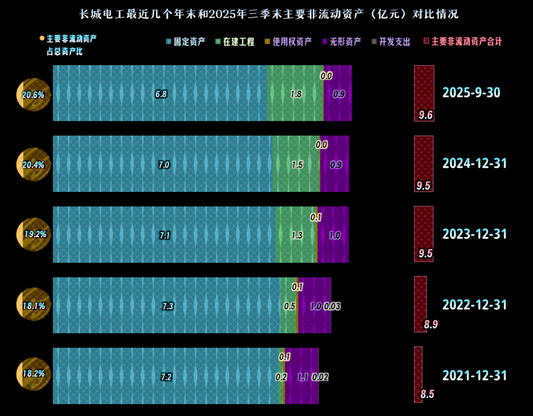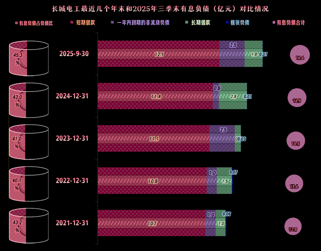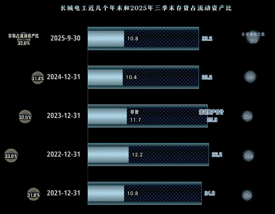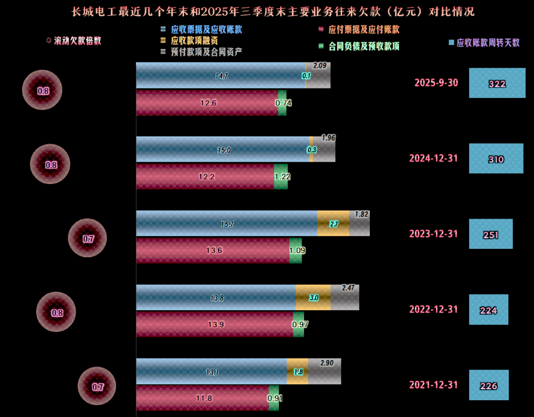长城电工的资产负债率持续上升,2025年三季度末已经接近八成了,年末可能会达到或超过八成。长期偿债能力并不强,如果不依靠外力,自身的再融资能力也不是太大了。短期偿债能力看起来变化不大,这方面暂时出不了问题,但前提条件是经营形势要能稳定下来才行。