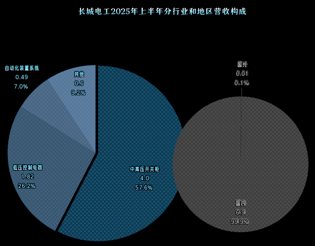 “中高压开关柜”是长城电工的核心业务,占比过半;“低压控制电器”占比超1/4,也是重要业务;还有少量的“自动化装置系统”和其他业务;基本上所有的收入都在国内市场取得。