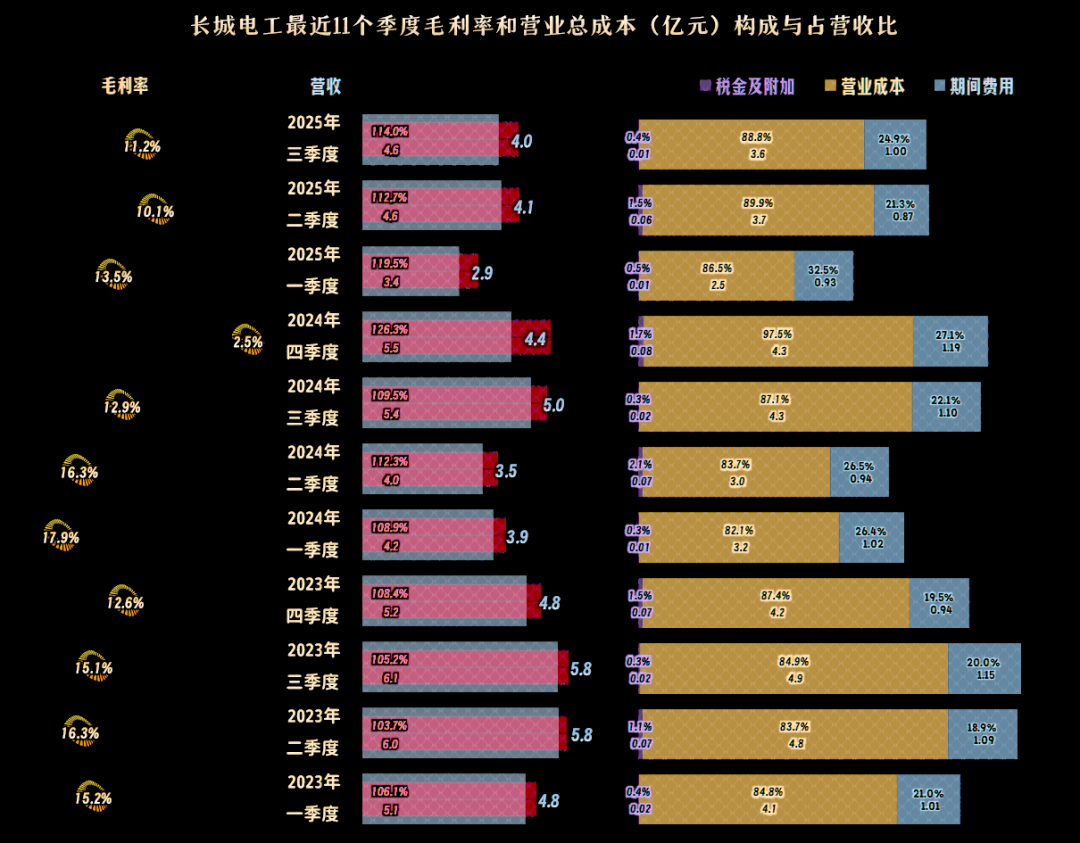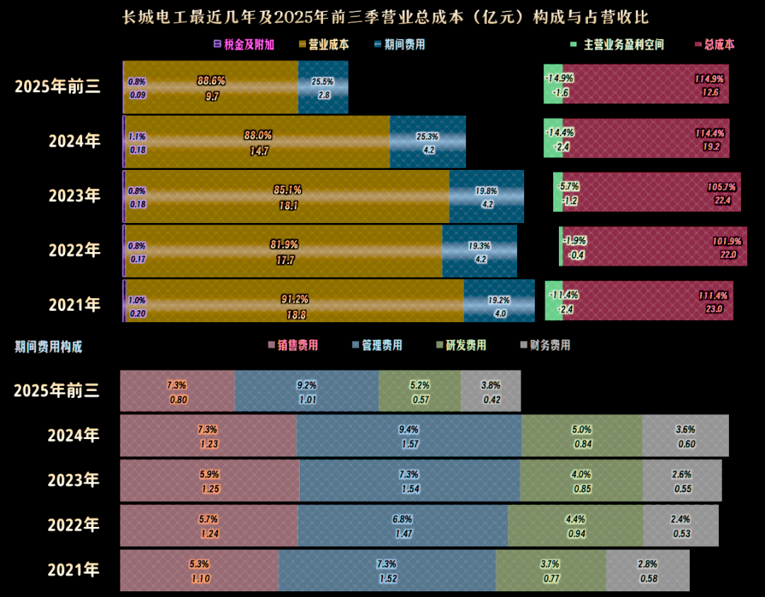 从2023年以来的营收下跌持续至今,但长城电工并不受这些“杂音”的影响,2023年和2024年的期间费用按计划,稳中有增的开支着,期间费用占营收比就只能持续上升了。2025年前三季度的期间费用同比开始下降,但营收下跌还是要更快一些,期间费用占营收比还是略有上升的。