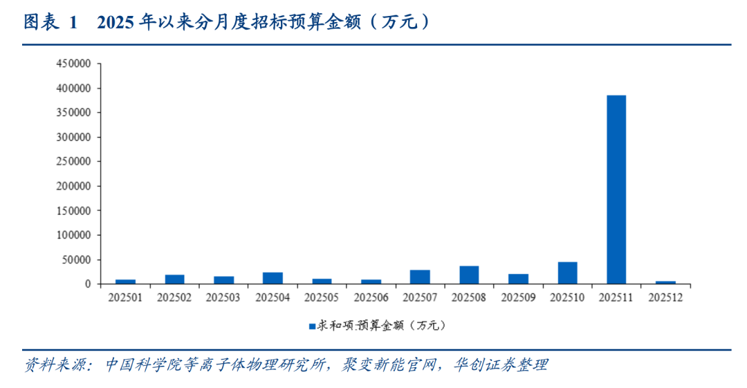 根据我们统计的招标数据,2025年11月,中科院合肥等离子体物理研究所及聚变新能安徽的招标项目显著放量,仅11月招标金额就达到39亿量级,而2025Q1、2025Q2、2025Q3的招标金额分别仅为4.48、4.40、8.72亿元,11月单月招标金额已显著超过前三季度招标金额的总和。