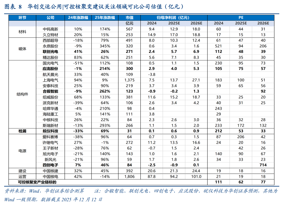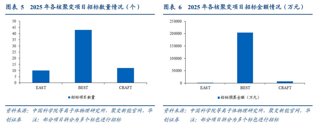 根据我们统计的招标数据,2025年1月1日至12月12日,BEST项目招标数量达到43个,招标预算金额达到20.43亿元,同期EAST、CRAFT项目的招标数据量仅为10、12个,招标预算金额分别为0.18、0.77亿元。其中,EAST项目多为升级维护,而BEST则涉及多个关键部件(磁体线圈、偏滤器、包层系统及第一壁)的招标,高价值量订单密集落地,表明行业或已逐步从密集招标步入密集中标的阶段,资本开支扩张逻辑持续验证。