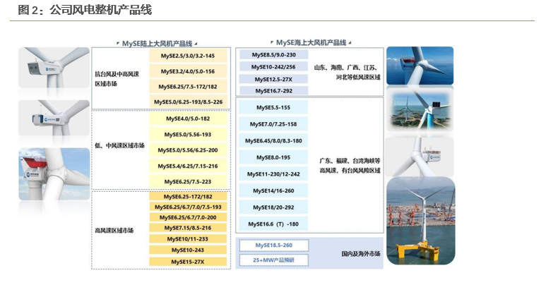 公司针对世界各地不同风况和气候条件,包括低温、沙尘、台风、盐雾、高原等严酷环境,研发和设计了适应不同特殊气候条件的陆上和海上风机,包括单机功率覆盖2.5-15MW 系列陆上型风机,以及单机功率覆盖 5.5-25MW 系列海上型风机。此外,公司创新性地提出漂浮式风机的概念,构建起 5.5MW、7.25MW 以及 16.6MW漂浮式风机技术创新体系。