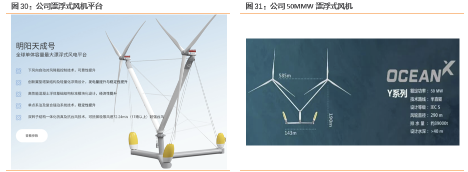 ■ 漂浮式风机技术领先,且成本大幅下降。公司率先发布50MW漂浮式风机产品,可实现整体造价小于1万元/kW,加速漂浮式商业化;
