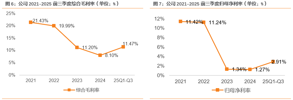 公司业绩开始好转,盈利能力修复。2025年公司前三季度营收恢复增长,主要原因系公司风机销量增加。2025年前三季度营业收入263亿元,同比增长30%,其中2025年前三季度公司风机对外销售12.28GW,同比增长60%;同时公司盈利能力好转,期间费用率持续下降,2025年前三季度毛利率、净利率较2024年均有明显改善。