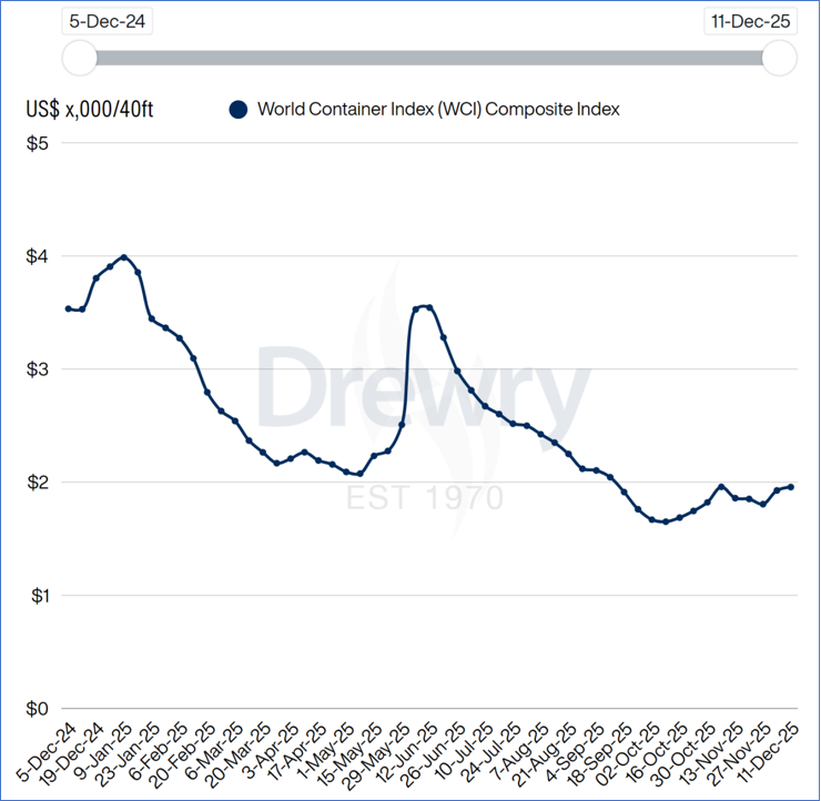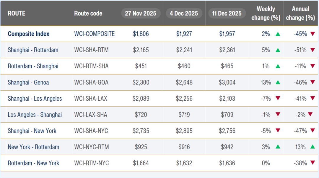 与此同时,截至12月11日,Drewry世界集装箱运价指数(WCI)涨2%至1957美元/FEU。