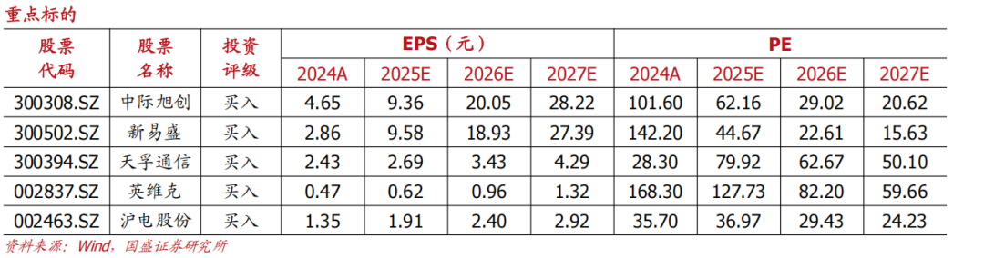 综上,我们继续看好算力板块,坚定推荐算力产业链相关企业如光模块行业龙头中际旭创、新易盛等,同时建议关注光器件“一大五小”天孚通信 仕佳光子/太辰光/长芯博创/德科立/东田微,建议关注国产算力产业链,如其中的液冷环节如英维克、东阳光等。