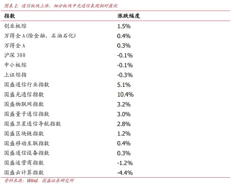 从细分行业指数看,光通信、物联网、量子通信、卫星通信导航、区块链、移动互联、通信设备分别上涨10.4%、3.2%、3.0%、2.8%、1.2%、0.4%、0.3%;运营商、云计算分别下跌1.2%、4.4%。