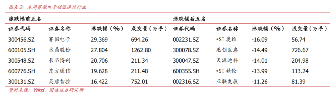 本周受益于光刻机概念,赛微电子上涨29%,领涨板块;受益于光纤概念,永鼎股份上涨28%;受益于芯片概念,长芯博创上涨21%;受益于商业航天概念,东方通信上涨20%;受益于芯片概念,英唐智控上涨16%。