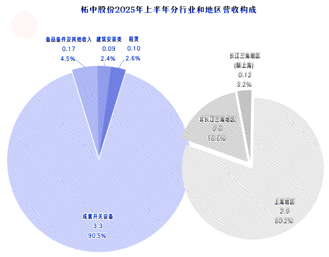 “成套开关设备”是柘中股份占比超九成的核心业务,还有少量的“备品备件及其他收入”、“建筑安装类”和“租赁”等业务。主要的市场在上海地区,占比超八成;非长江三角地区和除上海外的长江三角地区合计有近两成的占比。