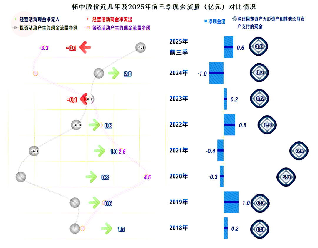 “经营活动的现金流量净额”表现良好,2023年和2025年前三季度出现过小额净流出的情况,但净流出的金额很低。再加上其2023年以来,几乎停止了固定资产类的投资,对资金等需求有限,经营活动的现金流方面,能维持平衡即可。