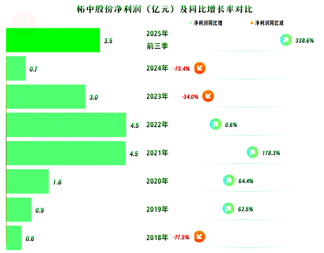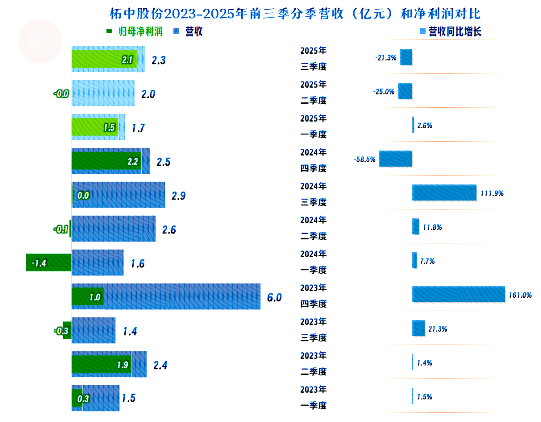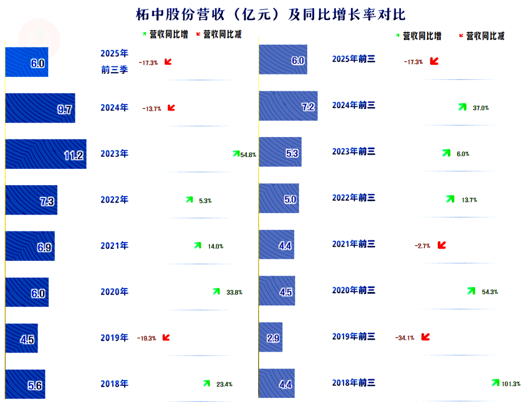 柘中股份的营收在2023年大幅增长超五成后,突破了10亿元大关,2024年前三季度再创同期新高;看起来一片大好的形势,在2024年四季度出现了转折,全年的营收并未创下新高,反而出现了下跌。2025年前三季度并未发生奇迹,而是延续了这一下跌的趋势。