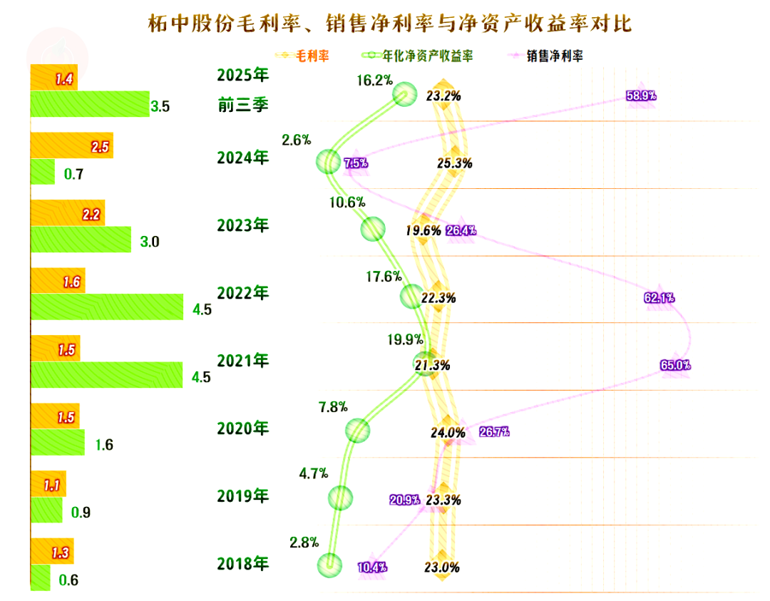 更加厉害,甚至是异常的表现,那就是柘中股份的销售净利率,近年来,只有2018年、2019年和2024年低于毛利率,其他年份都高于毛利率。这当然不正常,难道柘中股份不开支期间费用吗?就算不开支,净利润也不会比毛利额高,所以说一定还有其他原因。