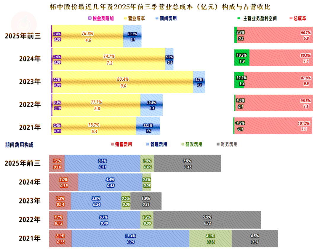前面已经看到,毛利率是相对稳定的,差异就在期间费用方面,2023年和2024年的期间费用大幅下降,2024年期间费用占营收比,较2021年下降了近17个百分点,正是这样挤出来的盈利空间。2025年前三季度的情况又发生了变化,下降的期间费用占营收比又重新增长起来了,形势就再次反转了。
