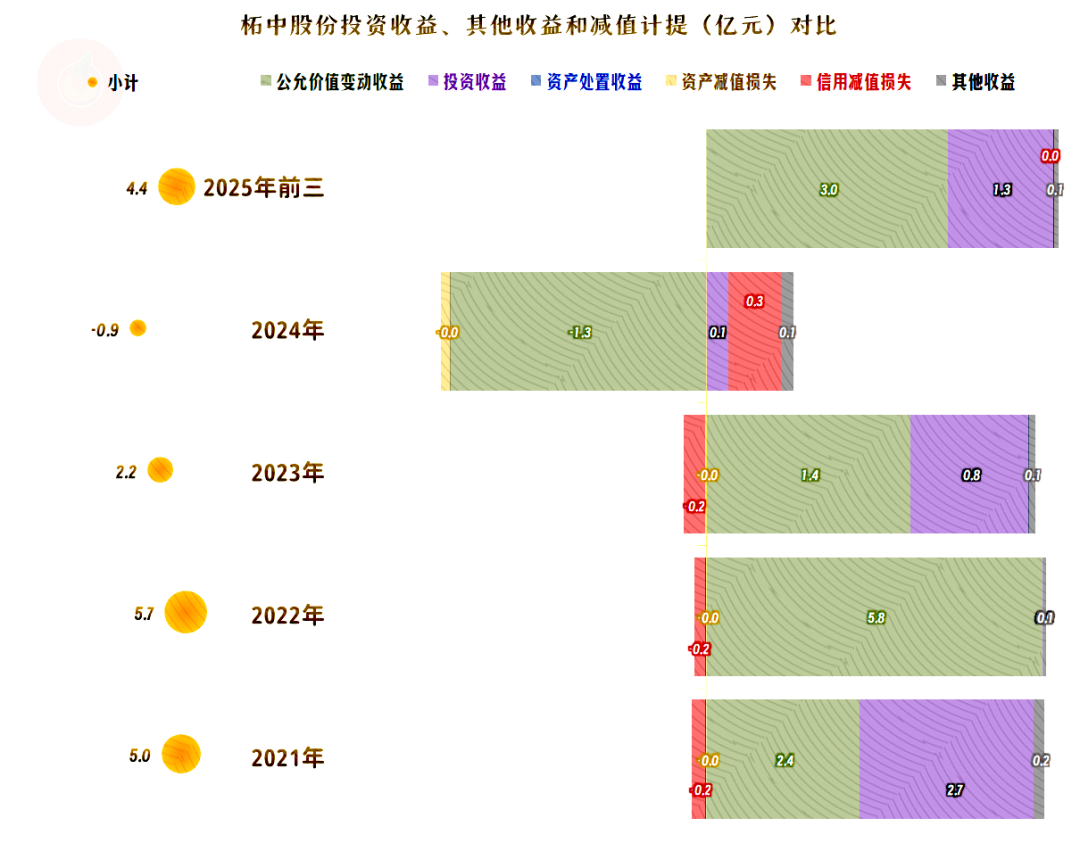 主要的收益项是“公允价值变动收益”和“投资收益”,其他项目的影响比较小。“公允价值变动收益”中全部是“其他非流动金融资产的公允价值变动收益”,这和其2025年三季度末的“其他非流动金融资产”高达24.3亿元有关。实际上是从2019年大幅增长的资产项目,全是“权益工具投资”,主要就是其他非控股的公司的股份,他们选择的是按“公允价值”来计量。