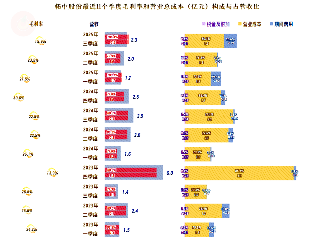 仅看主营业务方面,2023年和2024年的主营业务都是盈利状态,2025年以来的形势就相对严峻了,一季度和离现在最近的2025年三季度出现了主营业务亏损。主要原因是其毛利率在2024年四季度增长并超过三成之后,持续下跌了三个季度,2025年三季度已经跌至不足20%了。