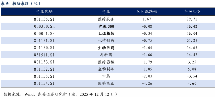 本周、年初至今A股医药指数涨幅分别为-1.04%、14.65%,相对沪深300的超额收益分别为-0.96%、-1.77%;本周、年初至今恒生生物科技指数涨跌幅分别为-1.83%、77.09%,相对于恒生科技指数跑赢-0.41%、27.44%;本周医疗服务( 1.67%)股价有所上涨;化学制药(-0.75%)、原料药(-1.66%)、医药器械(-1.79%)、生物制品(-1.85%)、中药(-2.03%)、医药商业(-4.26%)等股价均有所下跌。